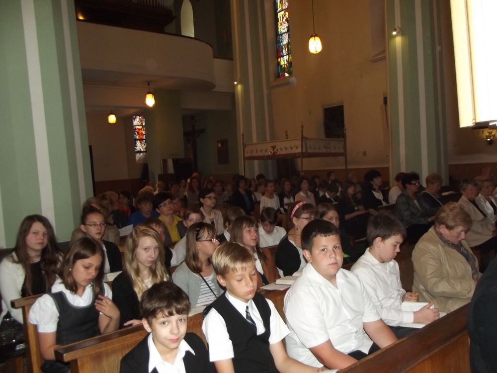 Cała społeczność szkolna wraz z nauczycielami zgromadziła się przed budynkiem szkoły, skąd w uroczystym pochodzie udała się do kościoła p.w. św. Ap. Filipa i Jakuba w Żorach. Tam odbyło się nabożeństwo ekumeniczne, któremu przewodzili - ks.Sebastian Kreczmański i proboszcz Tadeusz Makula.