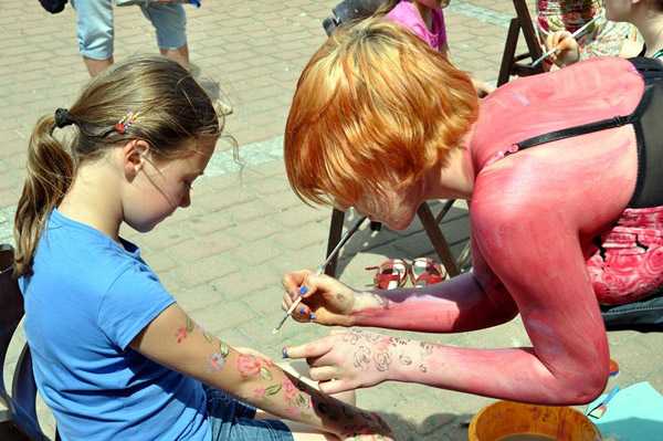 Malują studenci Wydziału Artystycznego Uniwersytetu Śląskiego - buzie, dłonie i ramiączka dzieciom, które chętnie przysiadają na przygotowanych dla nich krzesełkach i cierpliwie czekają na efekty pracy adeptów sztuk plastycznych.