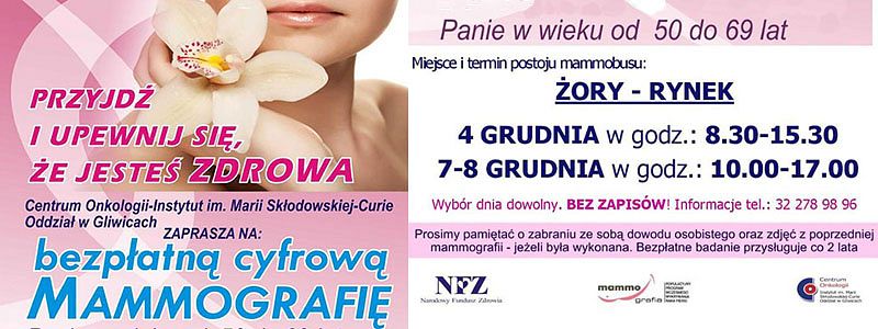 Już w grudniu na żorskim rynku po raz kolejny stanie mammobus Centrum Onkologii - Instytutu im. M. Skłodowskiej-Curie w Gliwicach. Panie w wieku od 50 – 69 lat będą w nim mogły wykonać bezpłatną cyfrową mammografię. Bezpłatna cyfrowa mammografia będzie wykonywana w piątek 4 grudnia w godzinach od 8:30 - 15:30 oraz 7 i 8 grudnia w godz. od 10:00 - 17:00. Szczegóły: