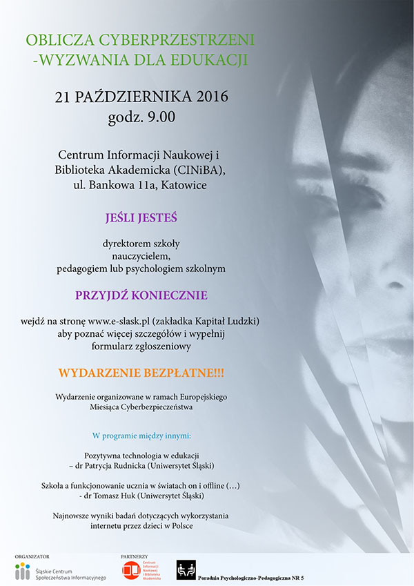 Pierwsza z konferencji pt. „Oblicza cyberprzestrzeni - wyzwania dla edukacji” będzie skierowana do dyrektorów szkół, nauczycieli, psychologów i pedagogów szkolnych. Odbędzie się w piątek 21 października o godzinie 9:00 w Centrum Informacji Naukowej i Bibliotece Akademickiej w Katowicach, przy ul. Bankowej 11A. Podczas spotkania będzie można porozmawiać zarówno o pozytywnych, jak i negatywnych skutkach wszechobecności nowoczesnych technologii w życiu szkoły. Uczestnicy dowiedzą się co można zrobić w codziennej pracy dyrektora, nauczyciela, psychologa i pedagoga szkolnego w świetle najnowszych wyzwań wynikających z wykorzystywania nowoczesnych technologii. Rejestracja odbywa się przez stronę internetową.
