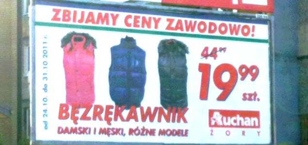 Sieć chwaląca się, że zbija ceny zawodowo pochwaliła się też, że zabija zawodowo rękawy i to na zimę. Szkoda tylko, że przy tym musiała zamordować polską ortografię. Być może chciała nauczyć nas francuskiej wymowy. Ech te żabojady.