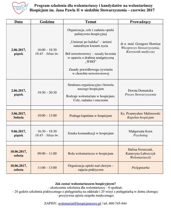 Więcej informacji o kursie można uzyskać pod numerem telefonu 660-745-844 oraz na stronie internetowej www.hospicjumzory.pl, gdzie dostępny jest pełny grafik zajęć. Zapisy są przyjmowane pod ww. numerem telefonu oraz pod adresem mailowym wolontariat@hospicjumzory.pl.