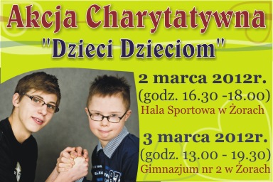 Pragniemy serdecznie zaprosić do udziału w Akcji Charytatywnej „Dzieci Dzieciom”, która odbędzie się 3 marca 2012 roku w Gimnazjum nr 2 im. Wojciecha Korfantego w Żorach. Koncert, stanowiący jej główną część, potrwa od godziny 13.00 do 19.30. Wszystkie środki finansowe uzyskane w ramach Akcji Charytatywnej „Dzieci Dzieciom” zostaną przeznaczone na pomoc i leczenie dzieci niepełnosprawnych. W ramach tej samej akcji 2 marca 2012 w Hali Sportowej w Żorach odbywać się będzie rodzinny turniej sportowy „Dzieci Dzieciom – na sportowo”. Dla uczestników (dzieci i rodziców) przygotowaliśmy różnorodne konkurencje sportowe oraz upominki i nagrody.