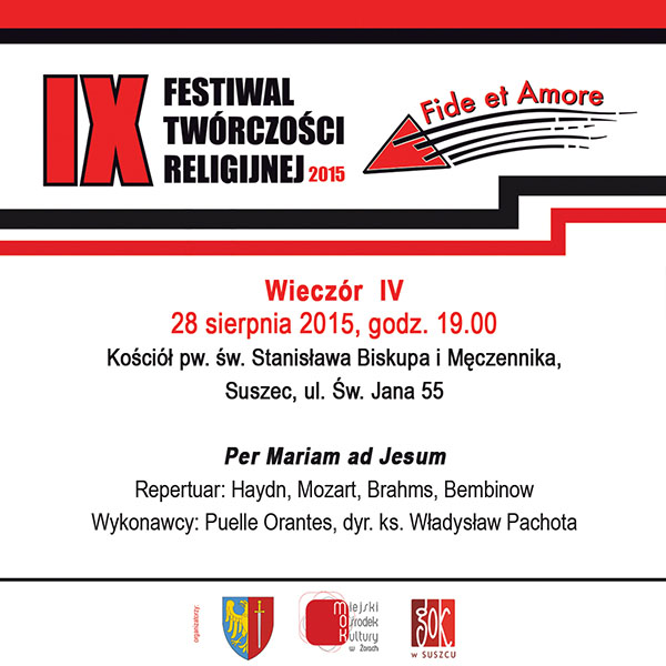 Już jutro - 28 sierpnia 2015 r. o godz. 19:00 w Kościele pw. św. Stanisława Biskupa i Męczennika w Suszcu odbędziue się koncert "Per Mariam ad Jesum" w ramach IX Festiwalu Twórczości Religijnej Fide et Amore. Zespół „Puellae Orantes" jest laureatem aż 23 konkursów chóralnych.