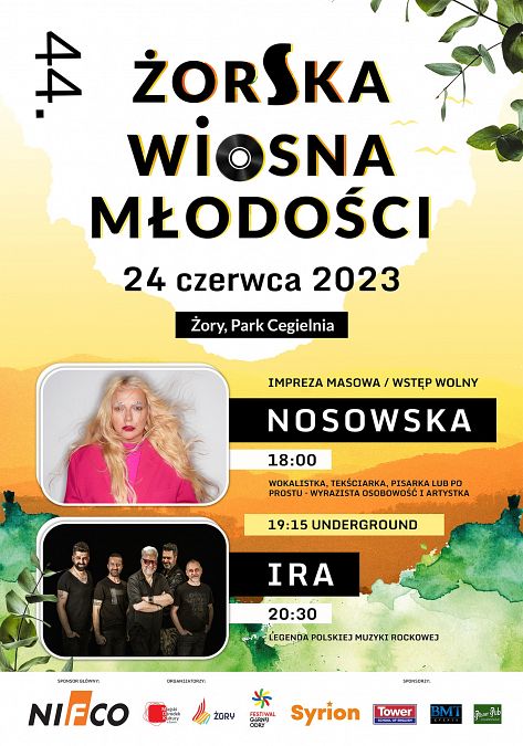Drugi dzień zabawy w Parku Cegielnia to 44. Żorska Wiosna Młodości. Zaczniemy ją od prawdziwej muzycznej petardy – w sobotę, o godz. 18:00 wystąpi Nosowska! Wokalistka, tekściarka, pisarka i po prostu jedna z największych polskich artystek oczaruje publiczność swoim głosem. Tuż po niej wystąpi świetny rockowy zespół z naszego regionu, czyli grupa Underground. Natomiast o godz. 20:30 rozpocznie się koncert legendy polskiego rocka, grupy IRA, świętującej 35-lecie działalności artystycznej!