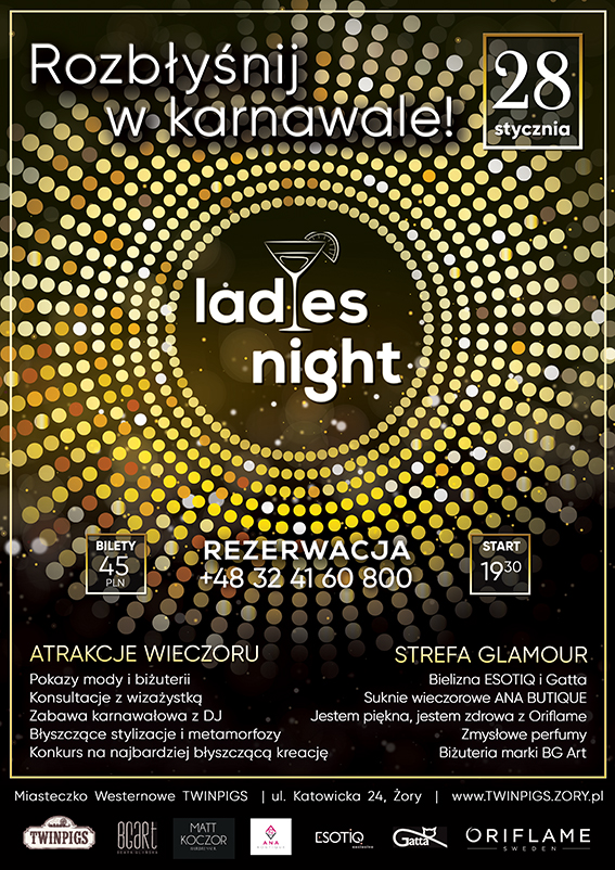Zapraszamy wszystkie Panie, Kobiety, Dziewczyny… na kolejną już imprezę z cyklu LADIES NIGHT. 28 stycznia Saloon w Miasteczku Westernowym TWINPIGS rozbłyśnie blaskiem brokatu, cekinów, lśniących materiałów i gustownej biżuterii. Poczuj się jak gwiazda filmowa i zadaj szyku tego wieczoru. Czeka Cię szalona noc w niezapomnianej scenerii, pełna niespodzianek, nowości ze świata mody i urody oraz spełnienia damskich zachcianek… Rozbłyśnij z nami w karnawale!