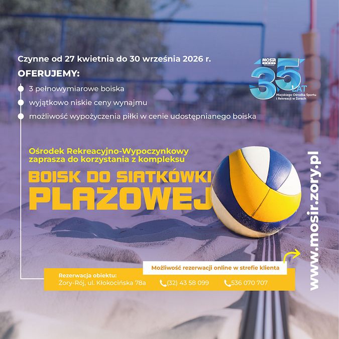 Ośrodek Rekreacyjno-Wypoczynkowy w Żorach-Roju zaprasza do korzystania z kompleksu boisk do siatkówki plażowej, dostępnych od 27 kwietnia do 30 września 2026 roku. Do dyspozycji użytkowników przygotowano trzy pełnowymiarowe boiska, które stanowią idealne miejsce zarówno do rekreacyjnej gry ze znajomymi, jak i do bardziej zaawansowanych treningów.