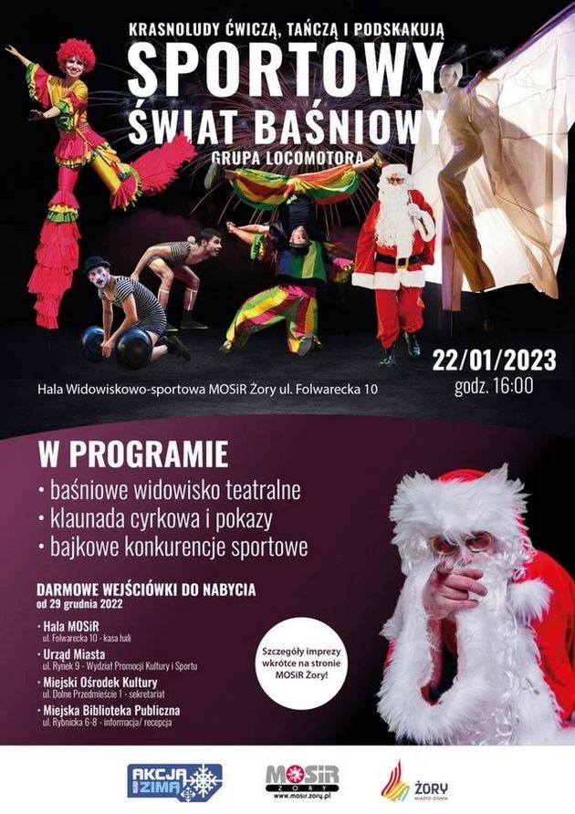 Miejski Ośrodek Sportu i Rekreacji w Żorach zaprasza na Sportowy Świat Baśniowy w ramach Akcji Zima 2023. 22 stycznia 2023 roku na Hali Widowiskowo-Sportowej widowisko teatralne zaprezentuję Grupa Locomotora.