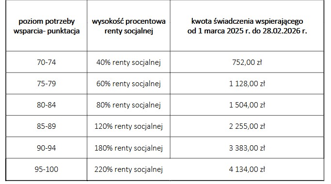Świadczenie wspierające funkcjonuje od 1 stycznia 2024 r. i jest przyznawane w zależności od liczby punktów podanych w decyzji WZON, według ustalonego harmonogramu. I tak
