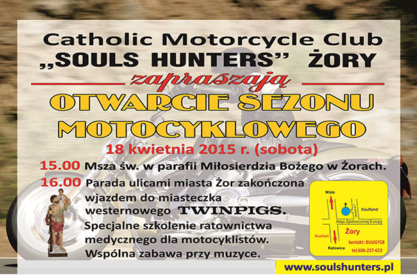 Klub "Souls Hunters" Żory zaprasza w sobotę - 18 kwietnia na otwarcie sezonu motocyklowego, o godz. 15:00 odbędzie się Msza św. w parafii Miłosierdzia Bożego, a o 16:00 - rozpocznie się parada ulicami miasta - zakończona wjazdem do miasteczka westernowego i wspólną zabawą przy muzyce.