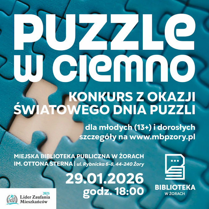 Konkurs „Puzzle w ciemno” w Strefie Młodych .Zapraszamy w Światowym Dniu Puzzli, 29 stycznia o godzinie 18:00, młodych i dorosłych do udziału w konkursie PUZZLE W CIEMNO. Uczestnicy otrzymają losowe pudełko puzzli, i nie widząc obrazka, postarają się go ułożyć w czasie 60 minut (z zegarkiem w ręku). Po jego upływie uczestnicy podejmą próbę odgadnięcia, co przedstawiają ich puzzle. Tematyka znanych zabytków i miejsc. Wygrywa osoba, która poprawnie odgadnie, co znajduje się na jej puzzlach. Przewidziane nagrody.