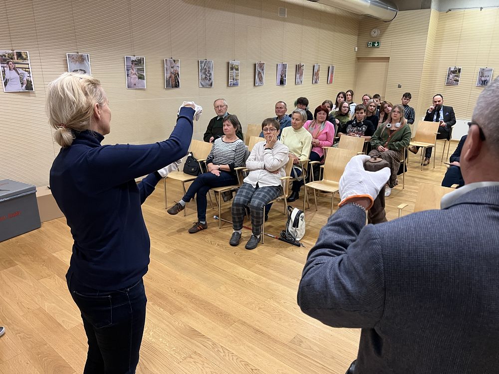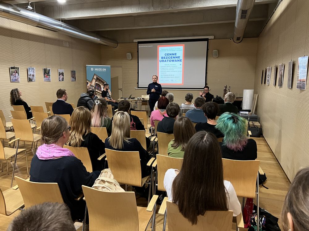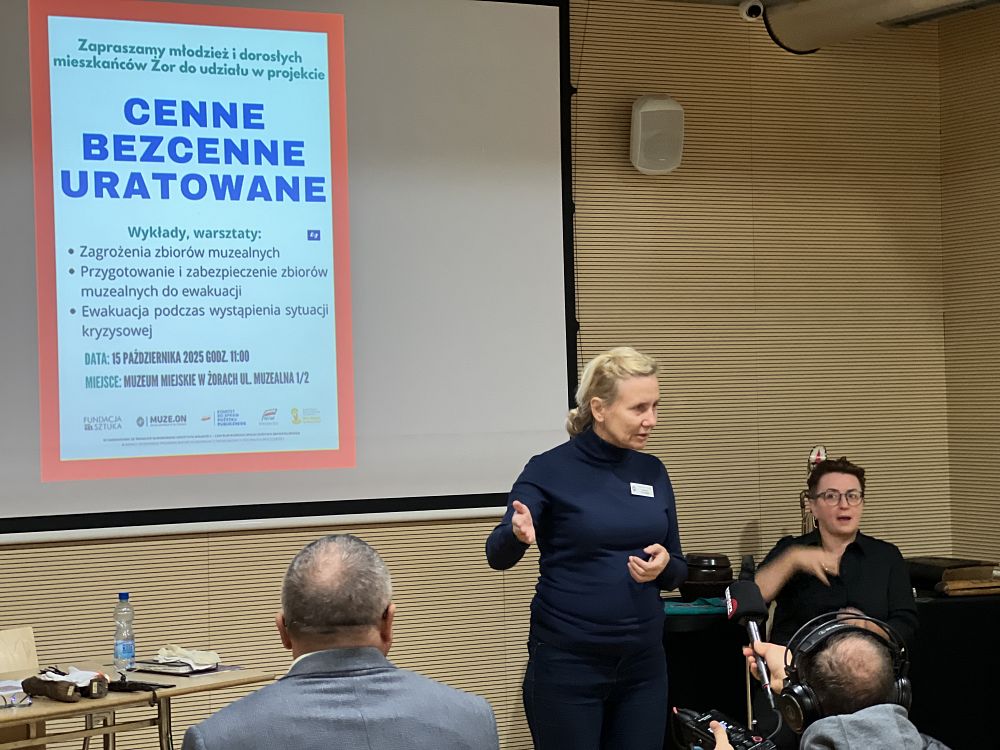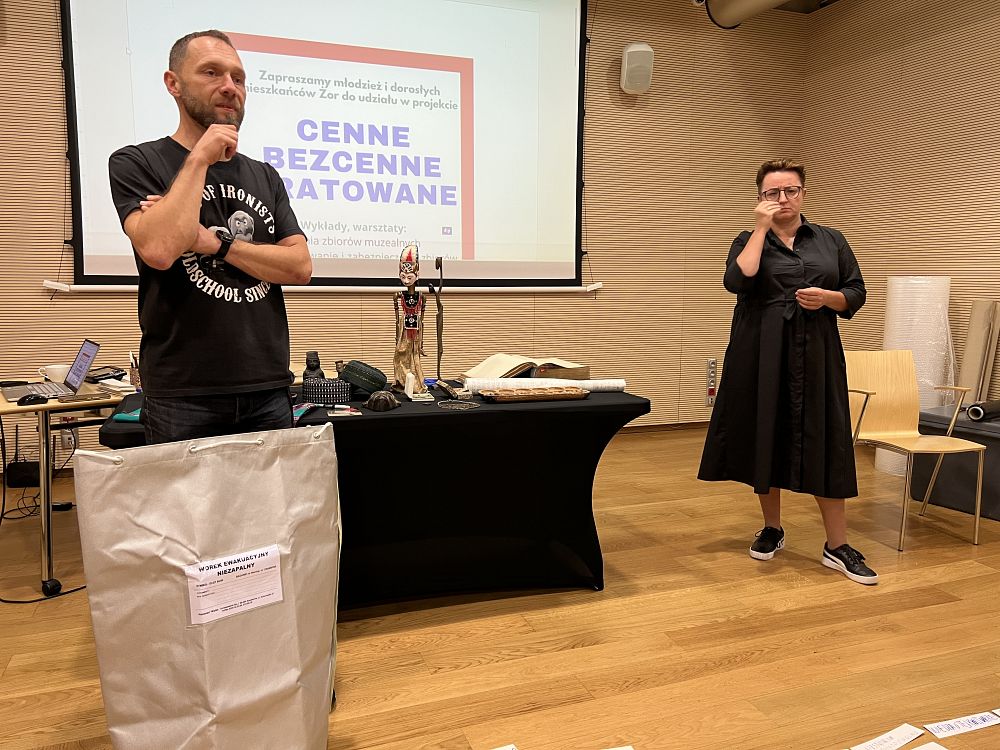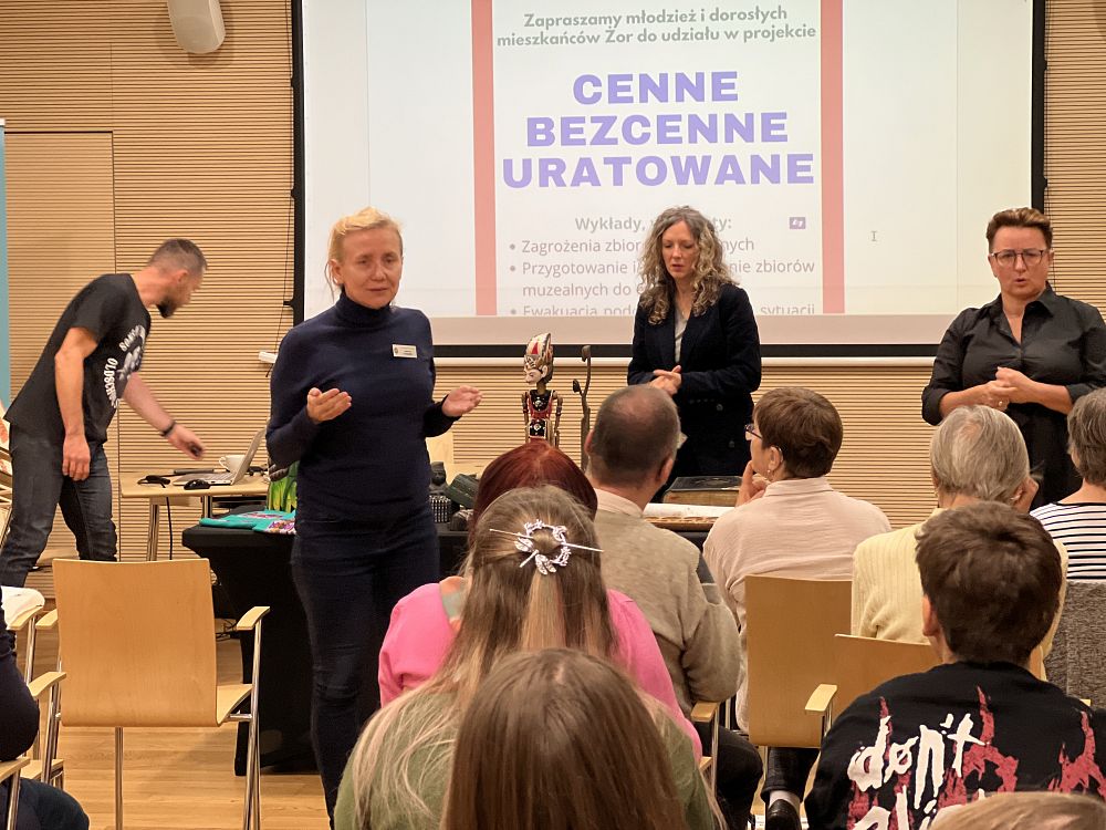 - Nie ma dobrych rozwiązań, nie ma mądrych na to wszystko. Jak się zachować, co zrobić. Pamiętajmy, to jest zagrożenie dla wszystkich. Możemy po prostu ćwiczyć, ćwiczyć, jeszcze raz ćwiczyć takie rzeczy, omawiać, kombinować, co zrobić, żeby jak najwięcej uchronić, żeby nasze działania były skuteczne – mówił przybyłym mieszkańcom miasta Lucjan Buchalik, dyrektor żorskiego muzeum. Zwrócił uwagę, jak ważne są zbiory muzealne dla przetrwania naszej kultury i przez to narodu. Na przykładach toczących się konfliktów zbrojnych zaprezentował, jakie występują zagrożenia dla zabytków i muzealiów. Mieszkańcy Żor, uczestnicy projektu „Cenne Bezcenne Uratowane” poznali unikalną wiedzę, jak można, czasem w sprytny i nieprzewidywalny sposób ochronić kulturę materialną przed tymi, którzy chcą zniszczyć tożsamość narodu, i w jaki sposób lokalna społeczność może w tym pomóc.