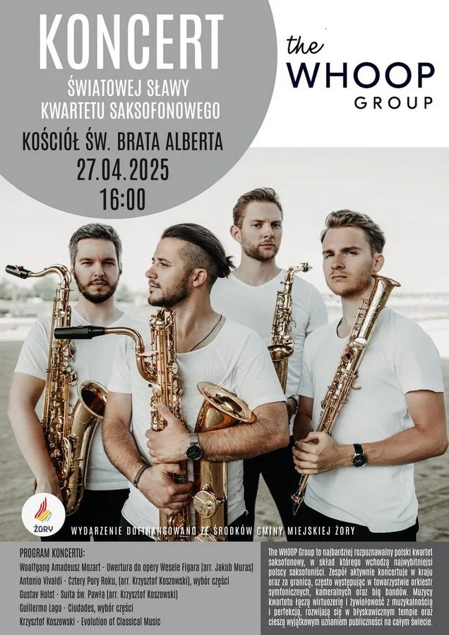Koncert The WHOOP Group odbędzie się w najbliższą niedzielę, 27 kwietnia o godzinie 16:00 w kościele pw. św. Brata Alberta w Żorach. W programie koncertu znajdą się m.in.: